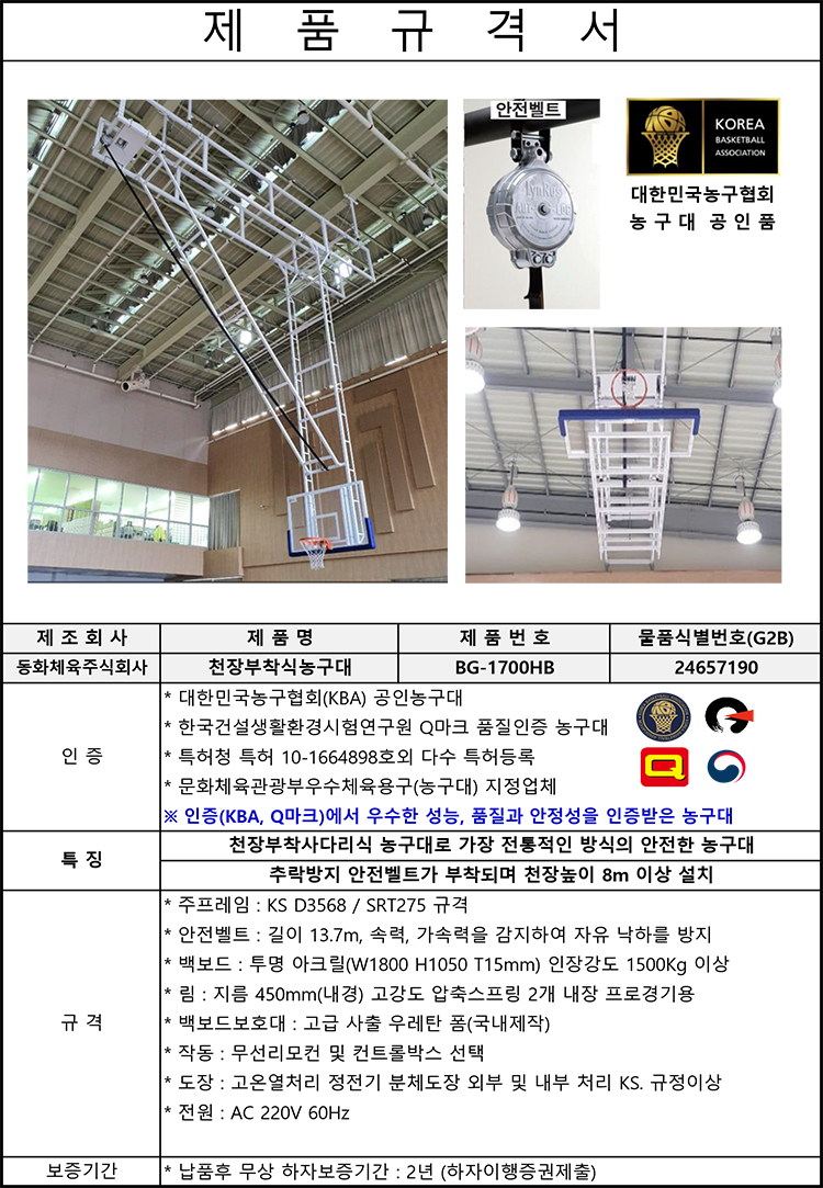 •안전을 최우선으로 제작된 농구대로 안정적이고 작동이 편리하며 천장 고정식의 특성상 하중 집중를 분한하여 제작
