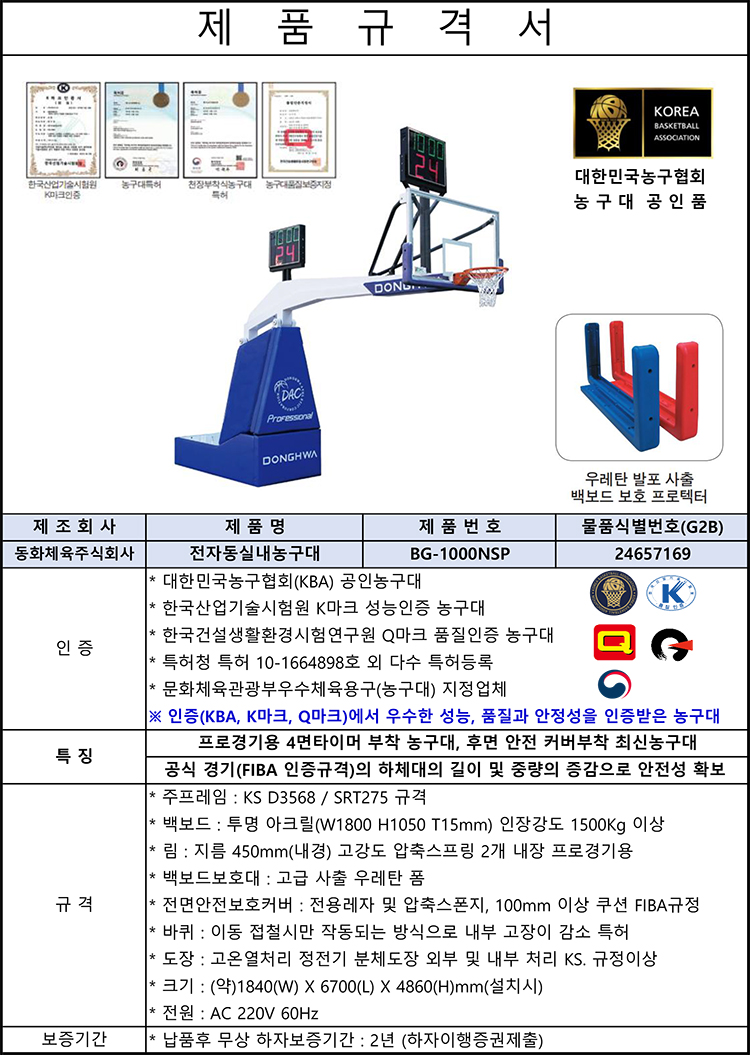 •전면보호쿠션은 FIBA공인규격 10cm이며 우레탄 발포 사출 백보드 보호 프로텍터를 부착한 공인품입니다.